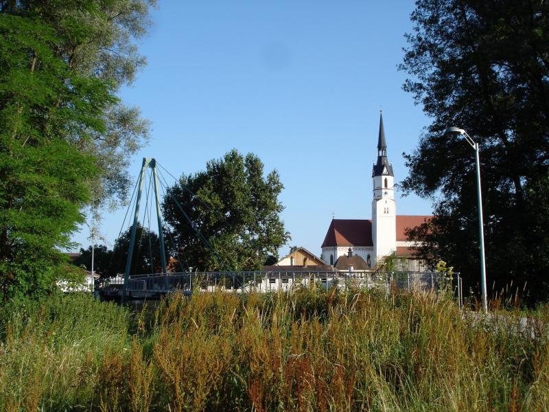 Blick auf Vilssteg und Pfarrkirche Marklkofen